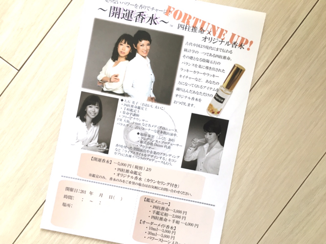 フレグランスプロデューサーの福田安里さんとタッグを組んでイベントしている「開運香水」は、あなたに取って必要な五行を香りに託してお届けしています。