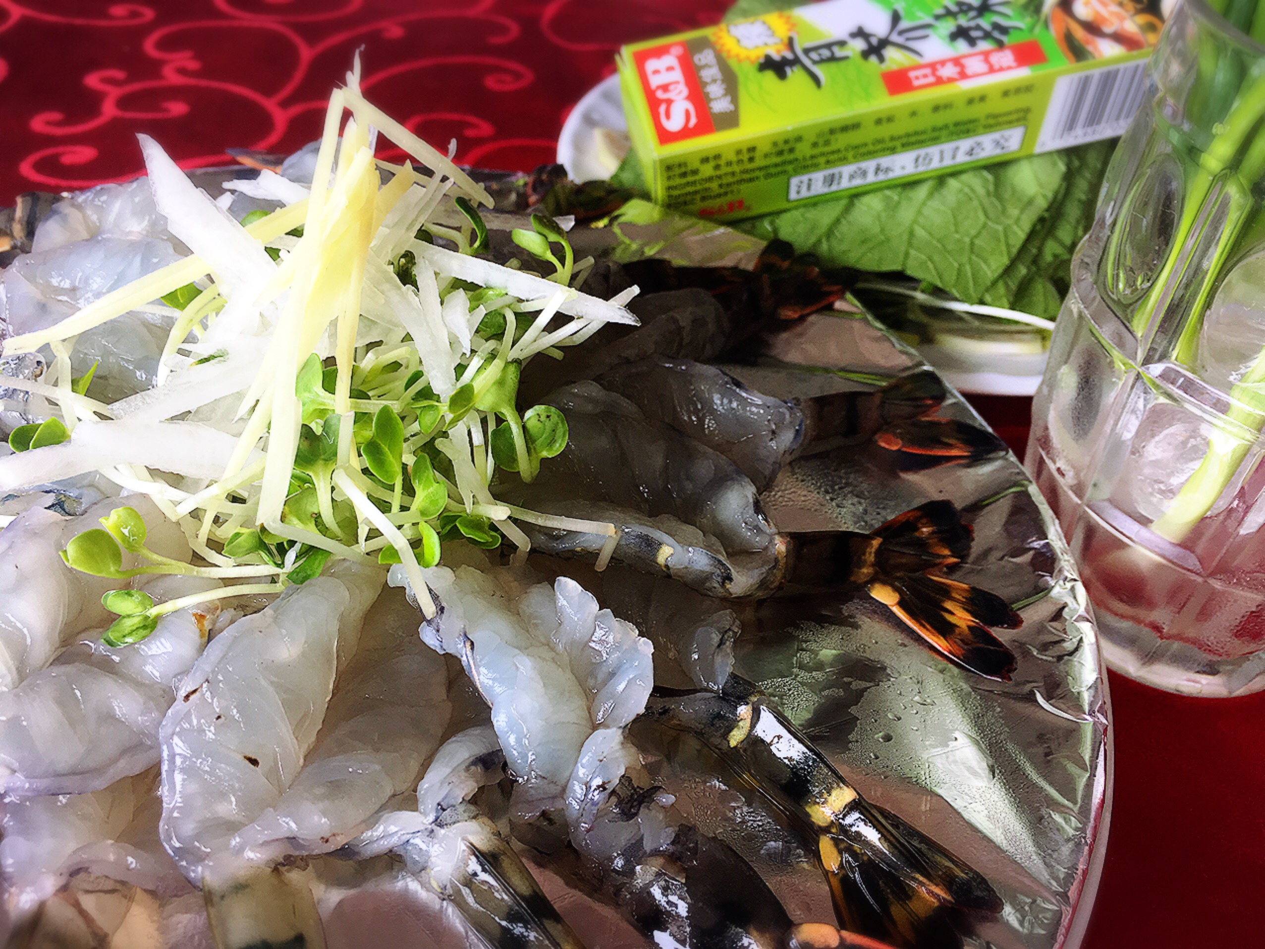 極め付けは、あり得ないほど大きなシャコ!!(比較用に、右端にえびのお刺身を置いてみました。)↓