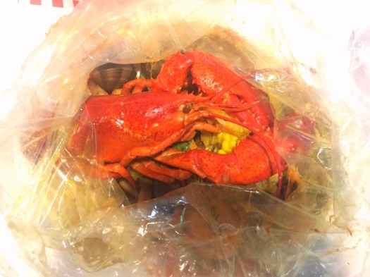 ビニール袋に入れられた熱々のロブスターや海老を、店員さんが揉みながら提供してくださいます…(^-^;