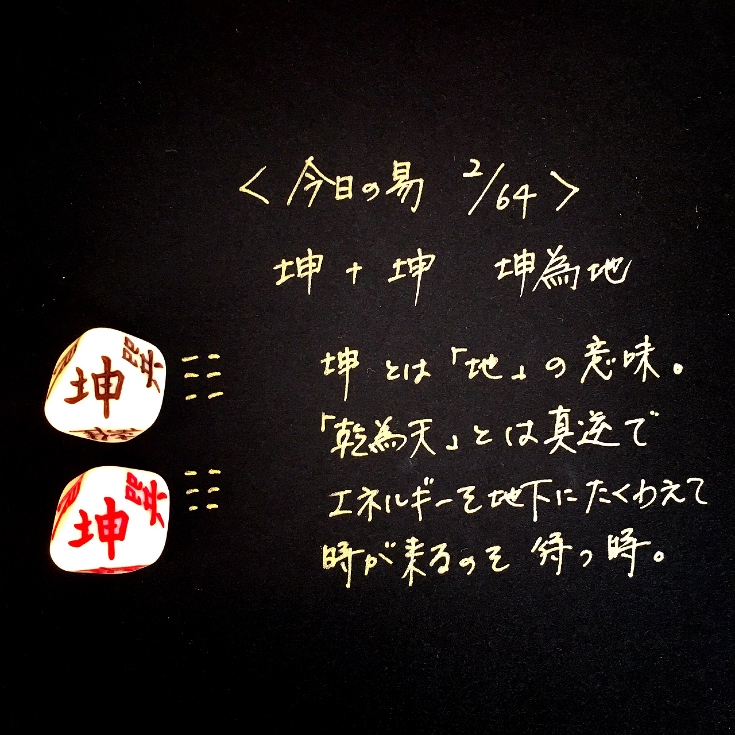 投稿日: 2017年11月3日2017年11月3日 投稿者: eikoohishi今日の易 2/64 【坤為地(こんいち)】 攻めより守り。受け身でいる方が今はいいですよ、との意。 こう言う時に急いても事を仕損じるのみ。時の流れと共に運気も上がったり下がったりするのは四柱推命でも明らかです。 いずれ運気が上がる時まで、ゆったり休息を取ったり勉強したりして、力を蓄えましょう。 そしてこんな時こそ日々を丁寧に過ごしましょう、と説いているのだと思います。 いい教えだなぁ…としみじみ(^^) シェア大歓迎です! Facebook で共有するにはクリックしてください (新しいウィンドウで開きます) Facebook クリックして X で共有 (新しいウィンドウで開きます) X