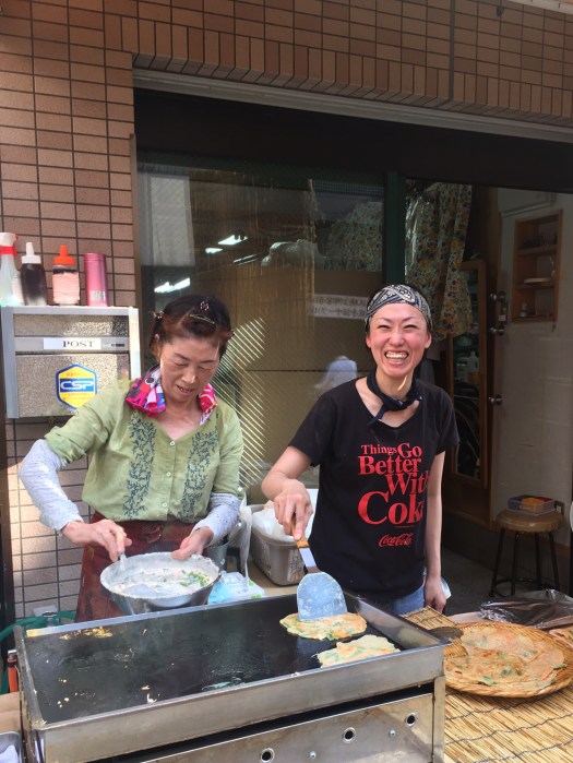 夕方5時のスタート前から飛ぶように売れていくチヂミ。これがここでの楽しみのひとつ。私も1枚頂いて腹ごしらえです。