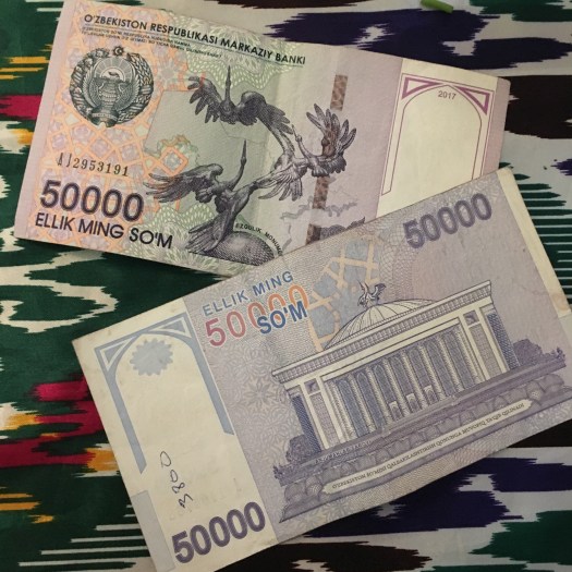 通貨はスム。70で割ると日本円に換算できます。最も高い紙幣・50000スム=714円。