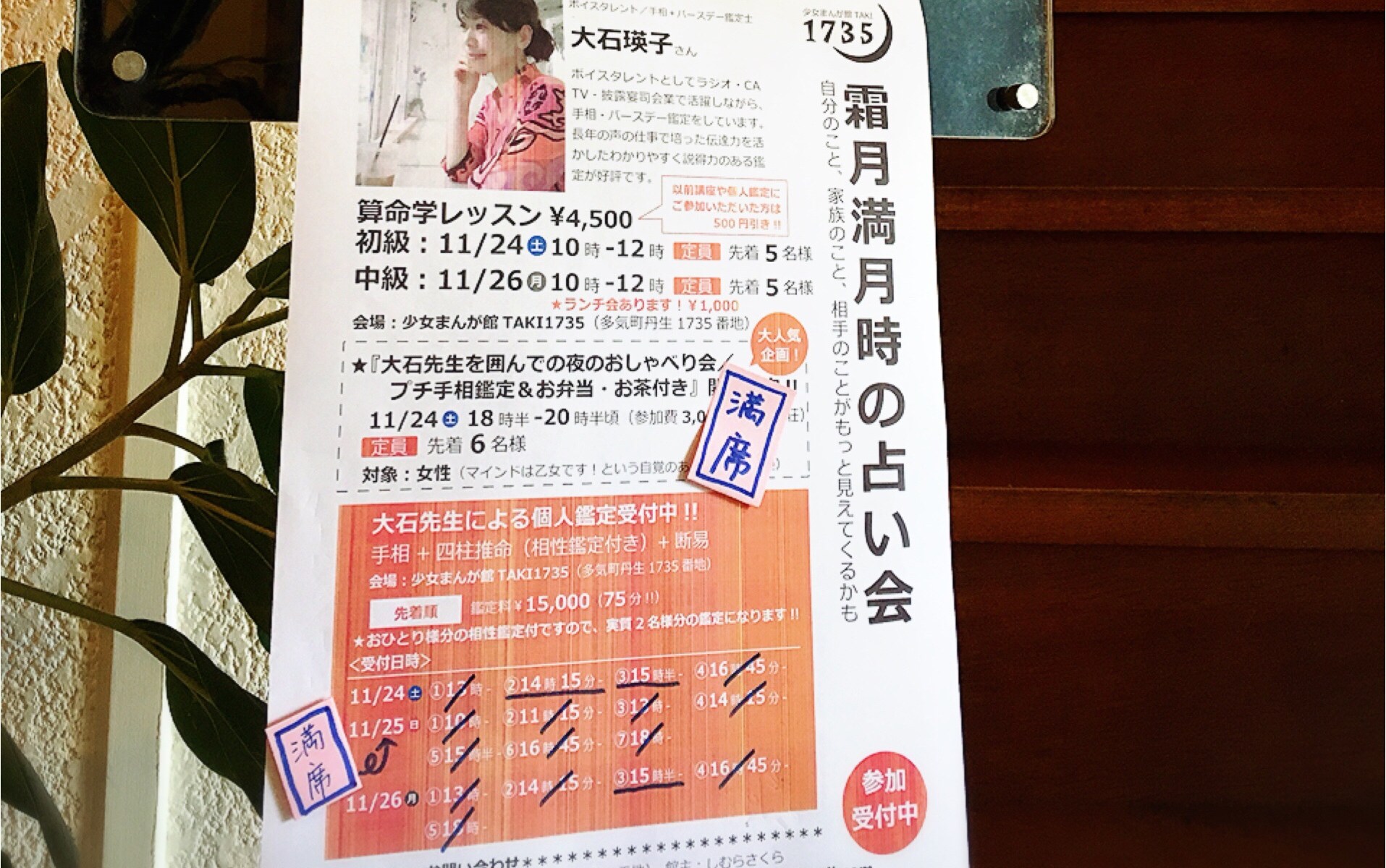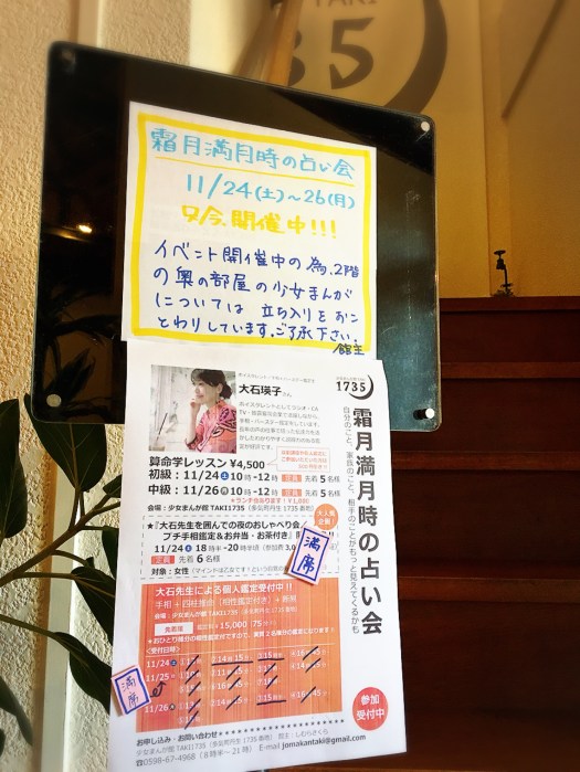 半年に一度のペースで、毎回素敵なタイトルで個人鑑定会を開催して下さる、三重県多気郡・少女まんが館TAKI1735さん。今回も3日間お世話になりました。