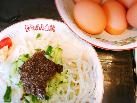 味噌ダレと、好みで備え付けのラー油やお酢を混ぜて頂くじゃじゃ麺。食べ終わったら、お皿に生卵を割って混ぜて店員さんに渡すとスープを入れて戻してくれる、一皿で二度美味しいスタイル。自分のお箸も店員さんに渡して、そのお箸でスープをかき混ぜてくださいます。