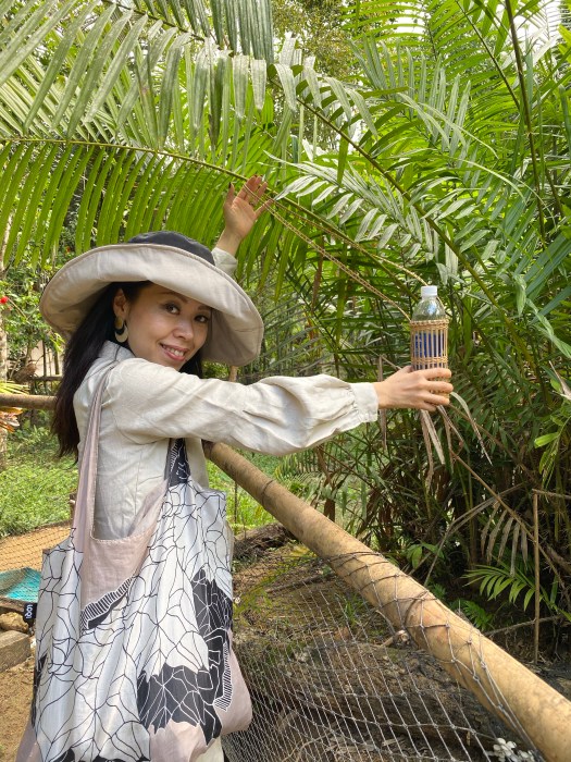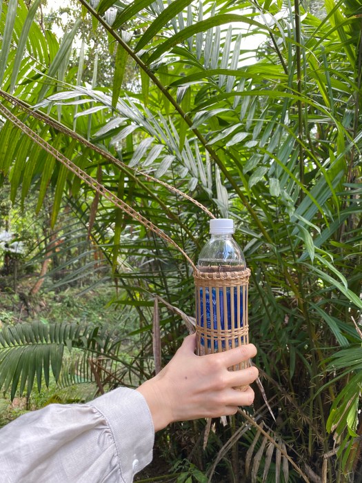 ↑散策前にこの葉で編んだペットボトルカバーをプレゼントしてくださいました。