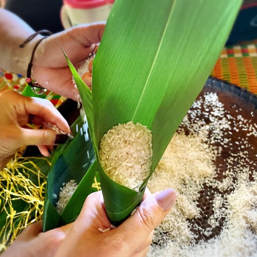 笹の葉の半分を円錐にして、そこにお米を詰めて三角に折り畳んでいきます。