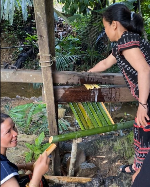 長い棒の先端に乗ってジャンプすると、反対側の先端でサトウキビが潰れて汁が出て、それを竹筒で掬い取っていきます。
